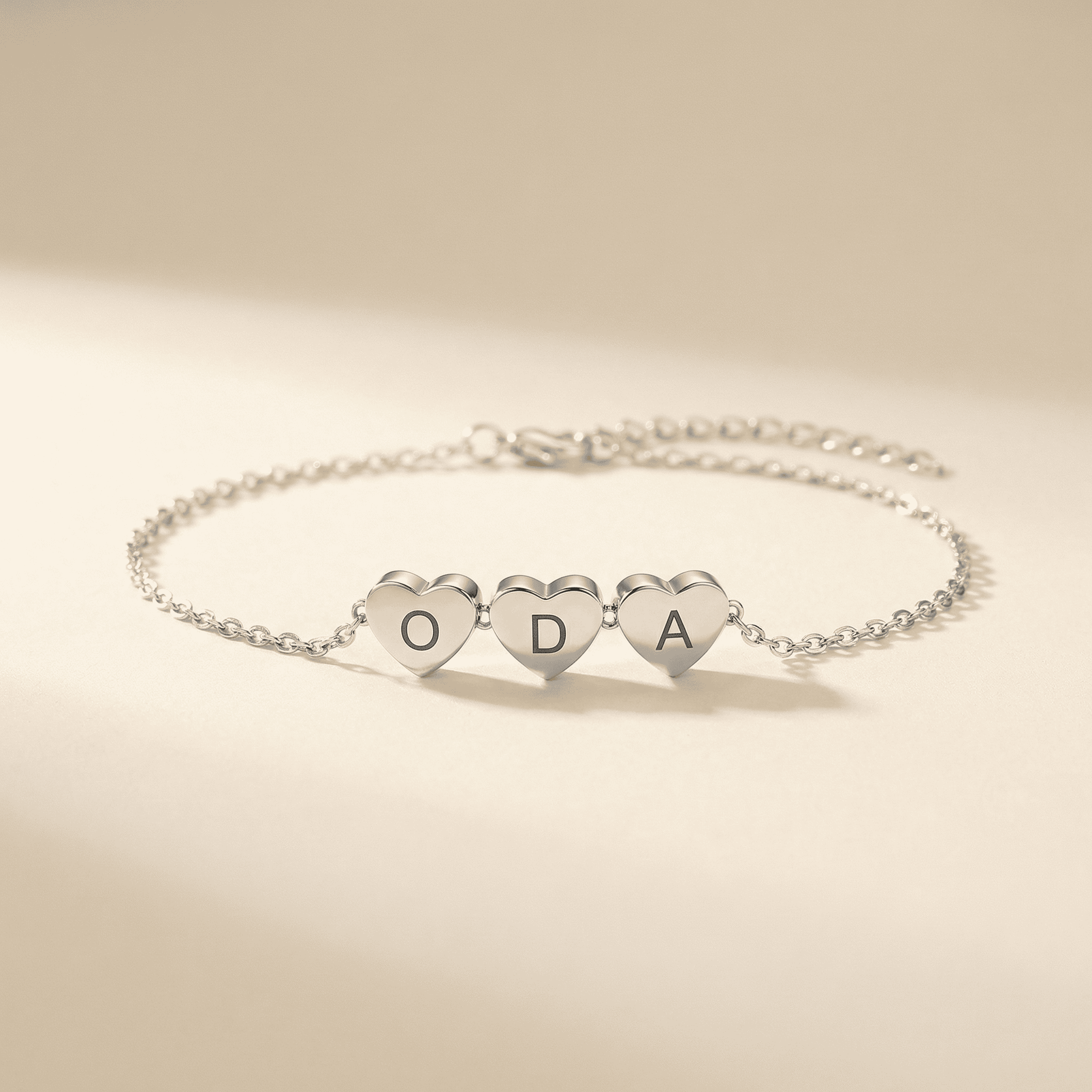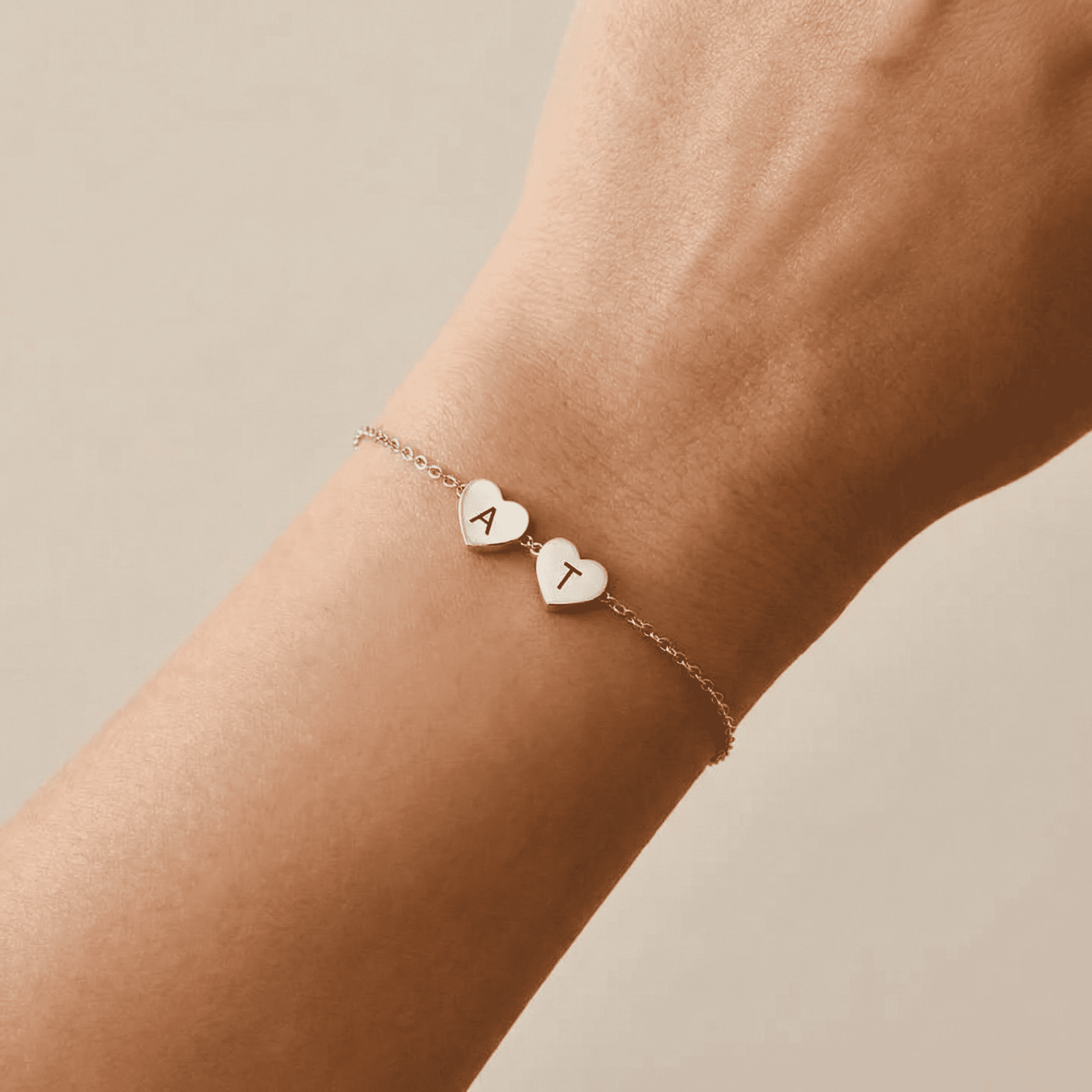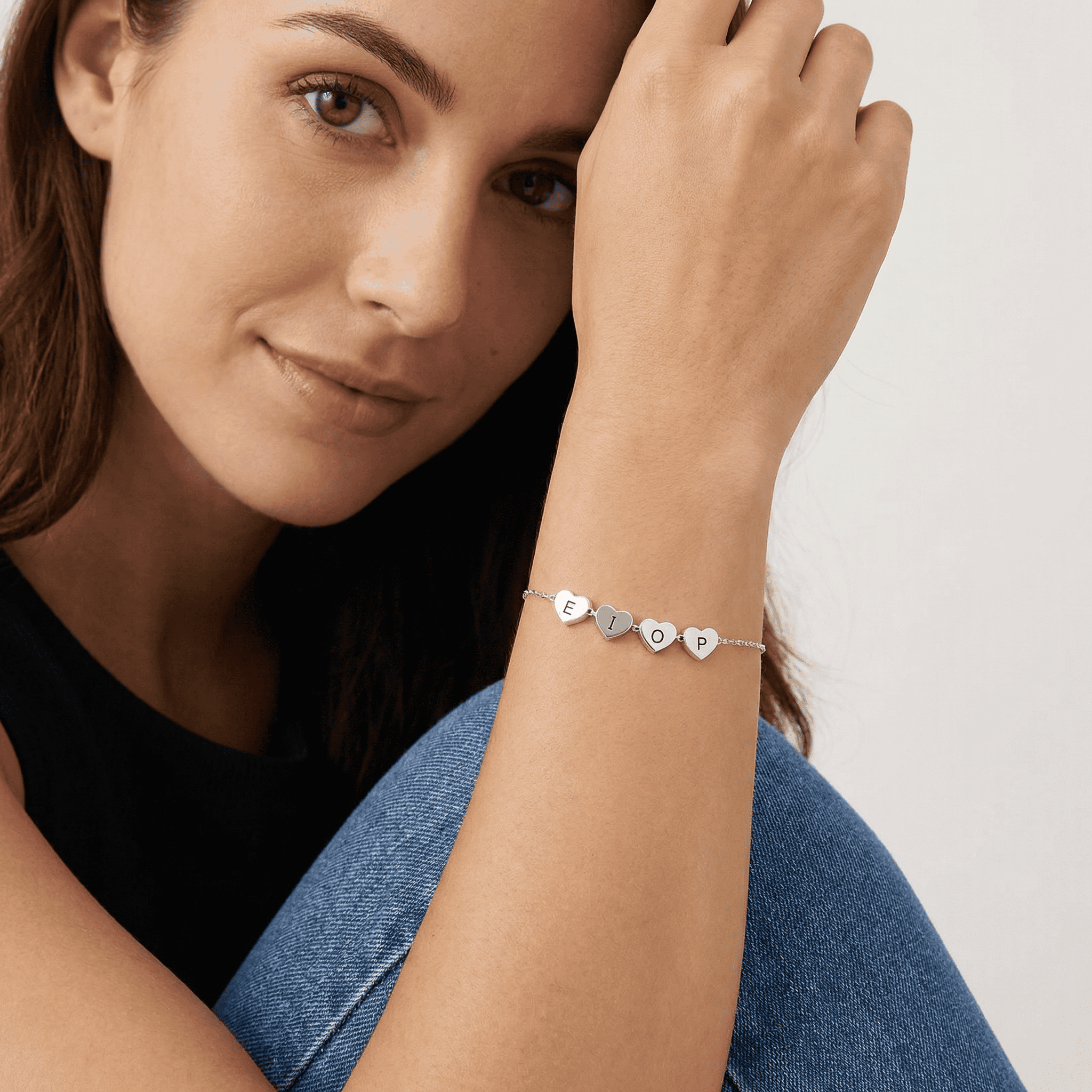 Tento jemný náramek zdobí drobné srdíčkové přívěsky s vygravírovanými iniciálami vašich milovaných. Ať už jde o děti, partnera nebo nejlepšího přítele – každá iniciála dodá osobní dotek nadčasovému minimalistickému designu, který nebudete chtít nikdy sundat.