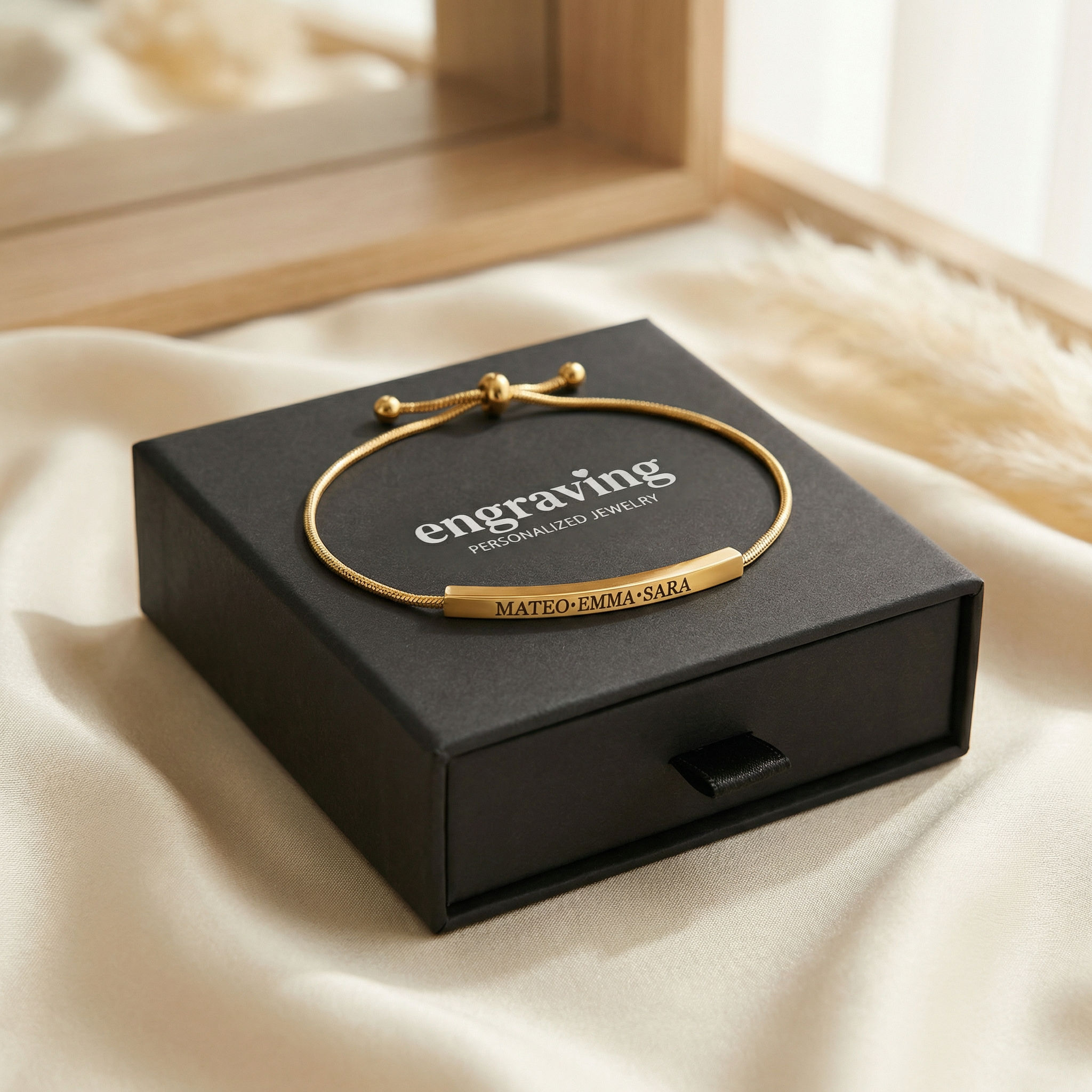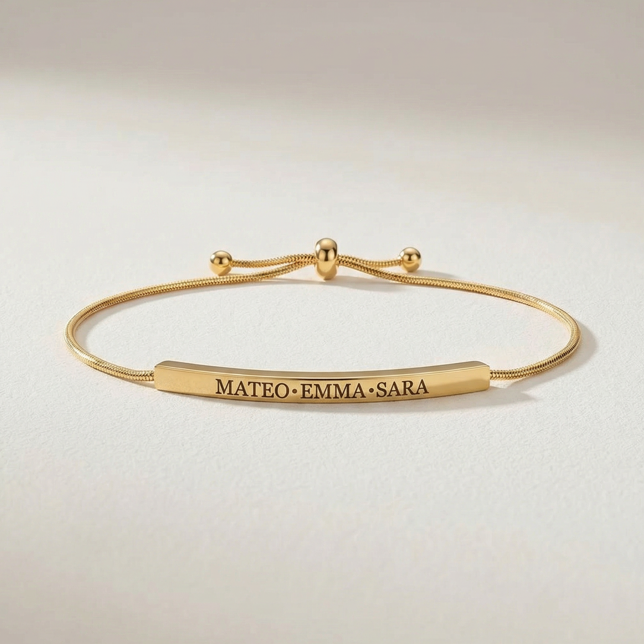 Narukvica će svojom podesivom duljinom savršeno pristajati vašem zapešću. Ugravirana imena djece ili poseban datum ono je što narukvicu čini tako posebnom. Odaberite bilo koju gravuru i dodajte svoje osobno značenje. Imena svojih voljenih uvijek nosite blizu srca.