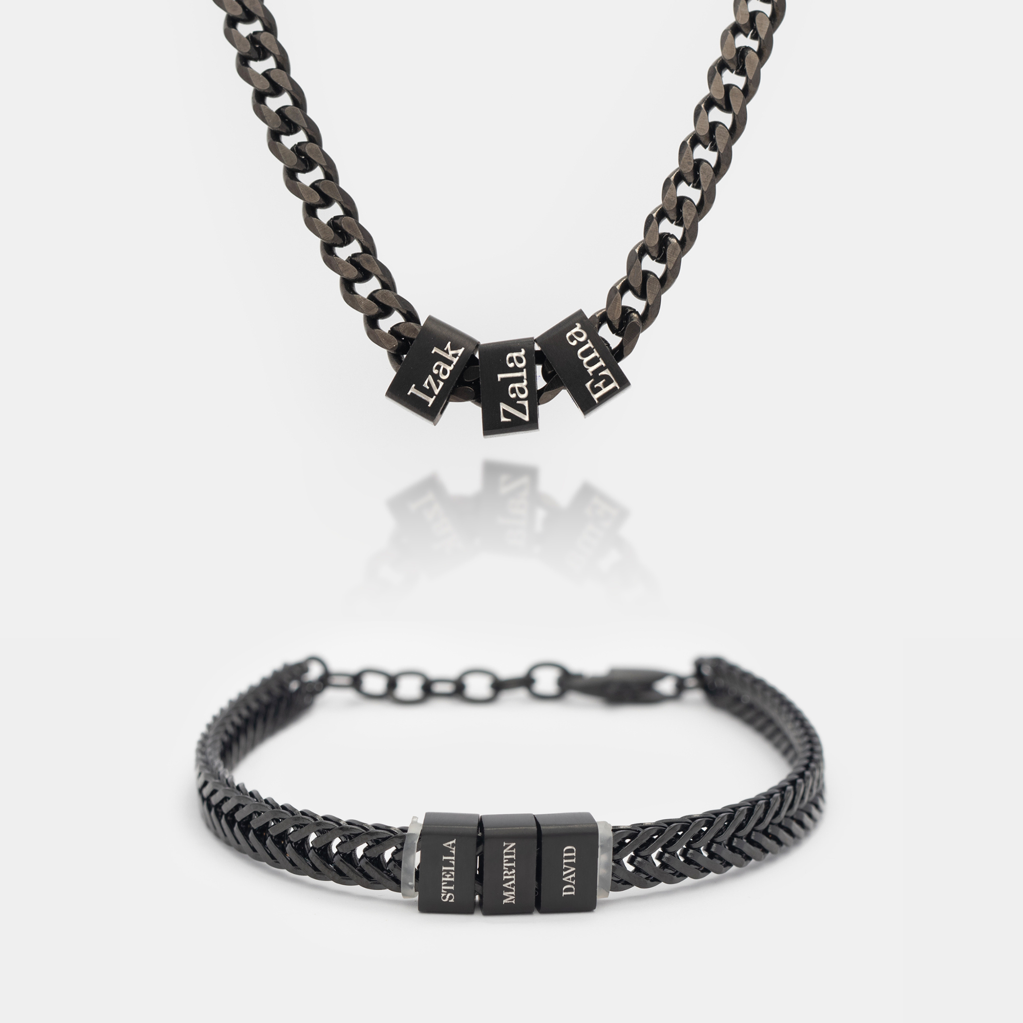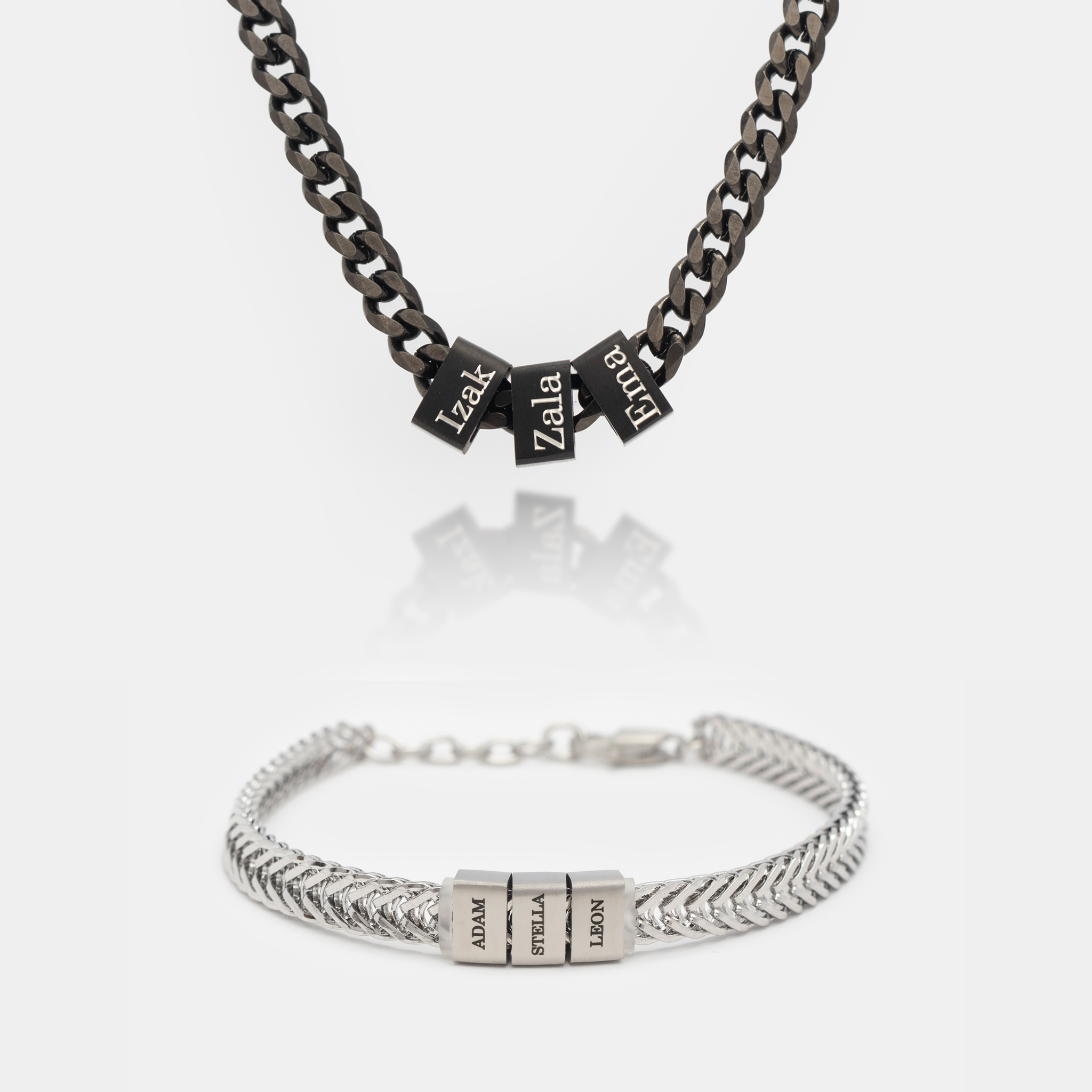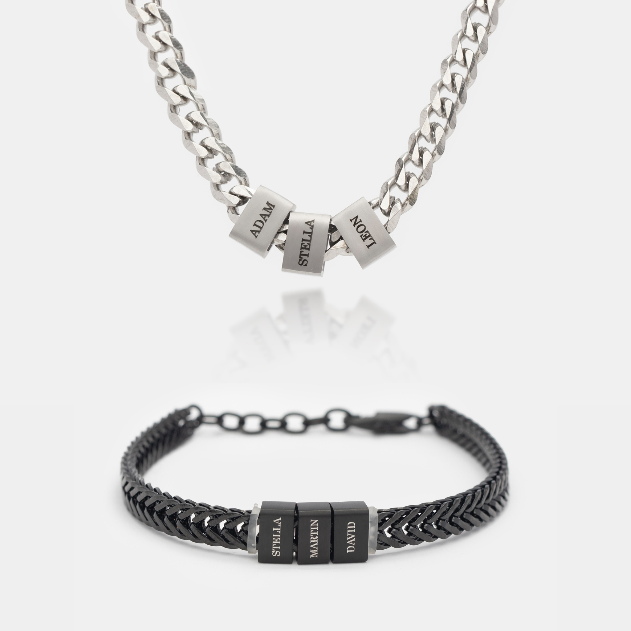 Most gifts sit in a drawer. This one becomes part of him. Complete Legacy Set with matching necklace and bracelet, custom engraved with his children's names or your names together. He'll wear it to work, to bed, everywhere. Because some men don't just love their family - they carry them. Give him the set that matches the weight he already carries.